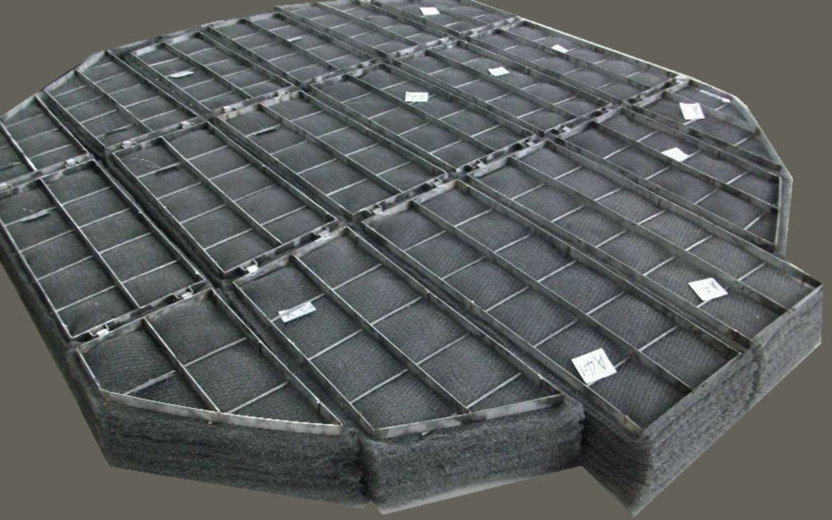 網(wǎng)塊是由若干層平鋪(圍繞)的波紋型氣液過濾網(wǎng)、格柵及定距桿等組合而成。